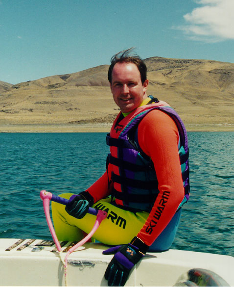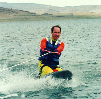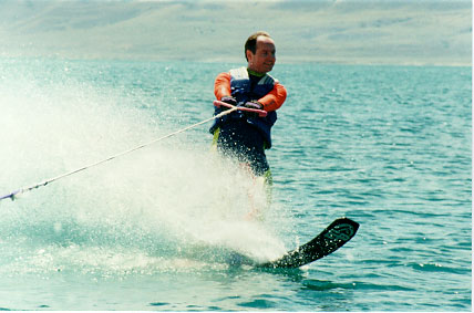 I took up water skiing about five or six years ago at the urging of my friends while we were up at Lake Tahoe. I got up on two skis on my 4th try, and found that despite the difference in balance from snow skiing (you don't generally have a high-speed engine pulling your arms out of their sockets in snow skiing, unless you still use a rope-tow to get up the hill!) that many of the same techniques for balance and weight shifts still apply.
