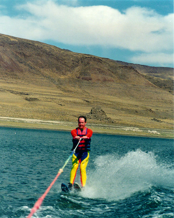 Pyramid Lake is in the middle of the Paiute Indian Reservation at 3880 feet above sea level, and while it's much warmer than Lake Tahoe, most of my friends and I are still inclined to wear wet suits when we water ski in it.