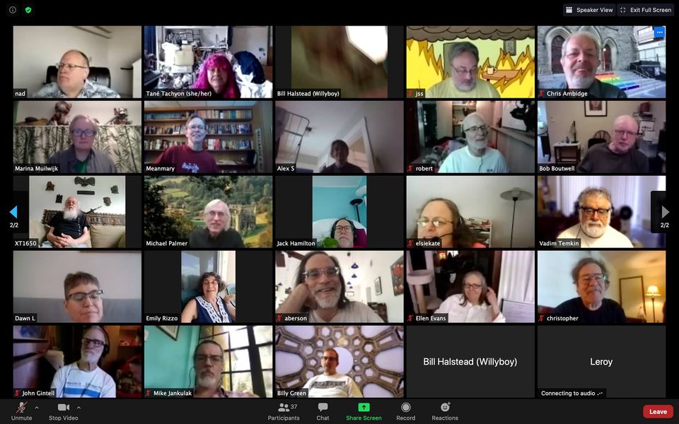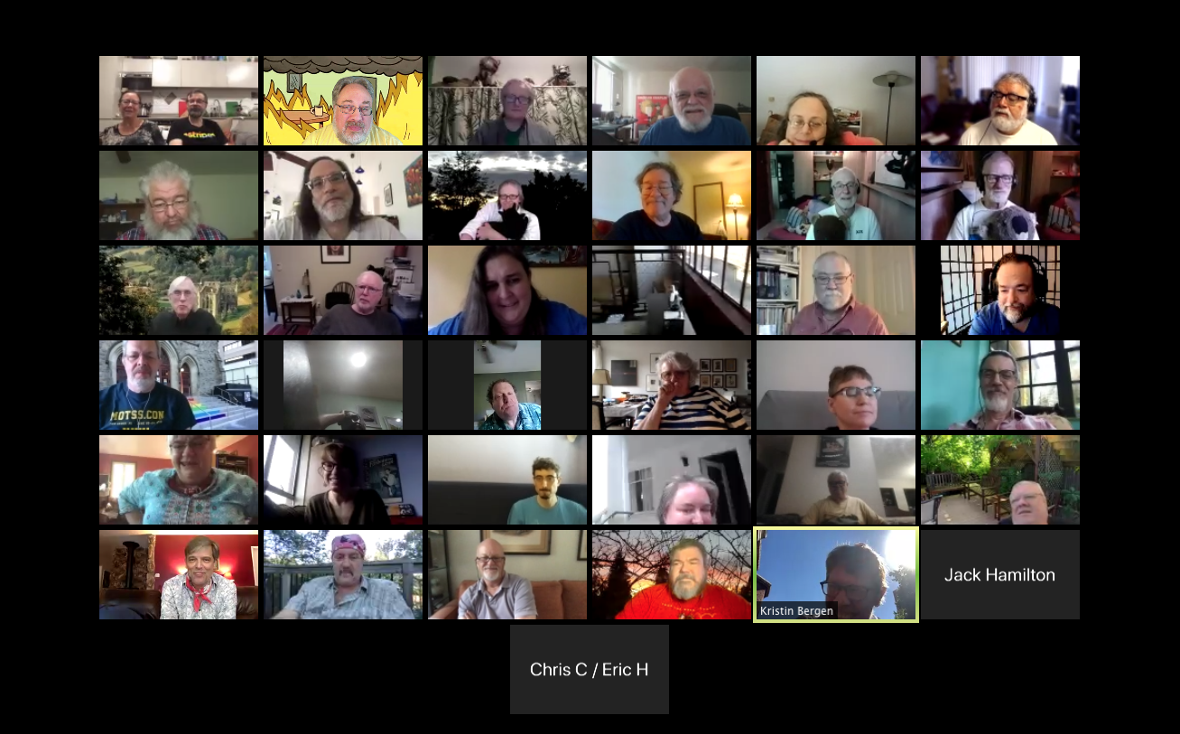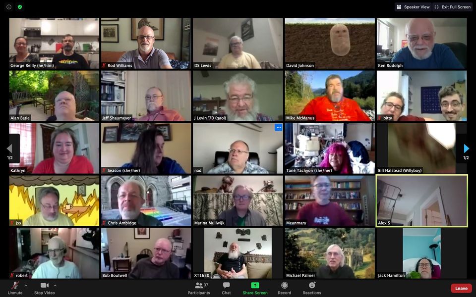 Our hosts, George and Emma, were in Dublin for a year and won the bid. Unfortunately, the reality of the COVID-19 pandemic meant we couldn't get together in person, for the first time in 33 years, so we wound up having a Zoom session instead. We had over 60 participants over the course of the 3 hours — I counted 61 unique individuals, excluding non-human pets — making it the largest con in a number of years. I had fun catching up, and it seemed like others did too.